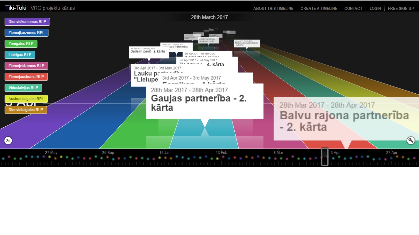 Biedrības "Latvijas lauku forums" mājaslapas lapā (http://llf.partneribas.lv/) ir pieejama saite (https://www.tiki-toki.com/timeline/entry/781633/VRG-projektu-krtas/) uz noslēgtajām, atvērtajām un plānotajām VRG kārtām 2014.-2020. gada periodā laika skalā, lai ikviens varētu iepazīties ar informāciju par projektu kārtām sev interesējošā teritorijā. Šo informācijas rīku var izmantot dažādos griezumos.
